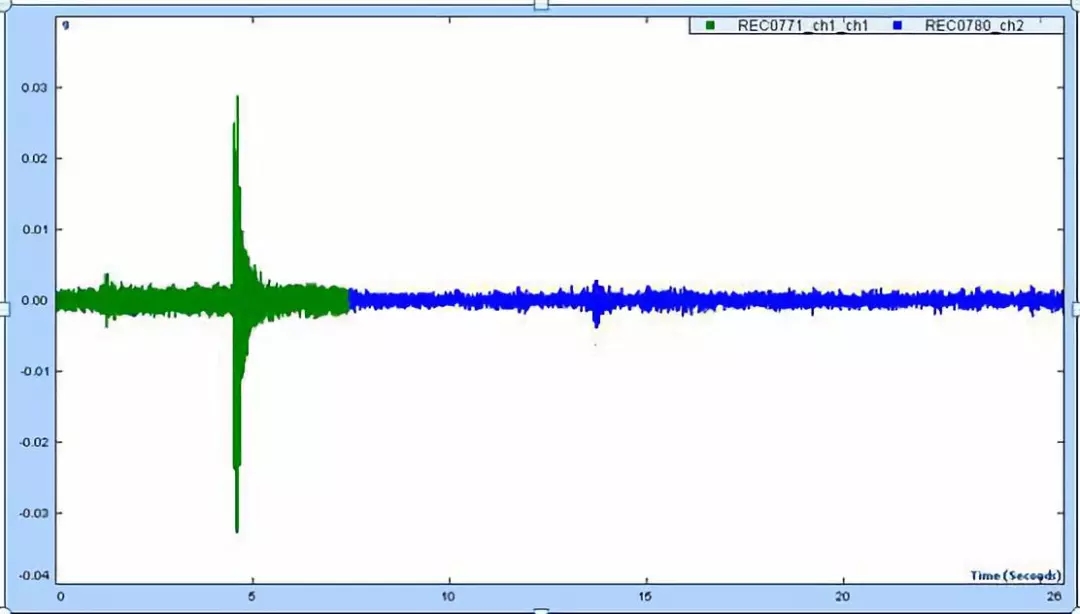 注:其中綠色部分為測量機地面未減振的振動值,圖中藍色部分為減振器上部測量機臺面上的振動值。