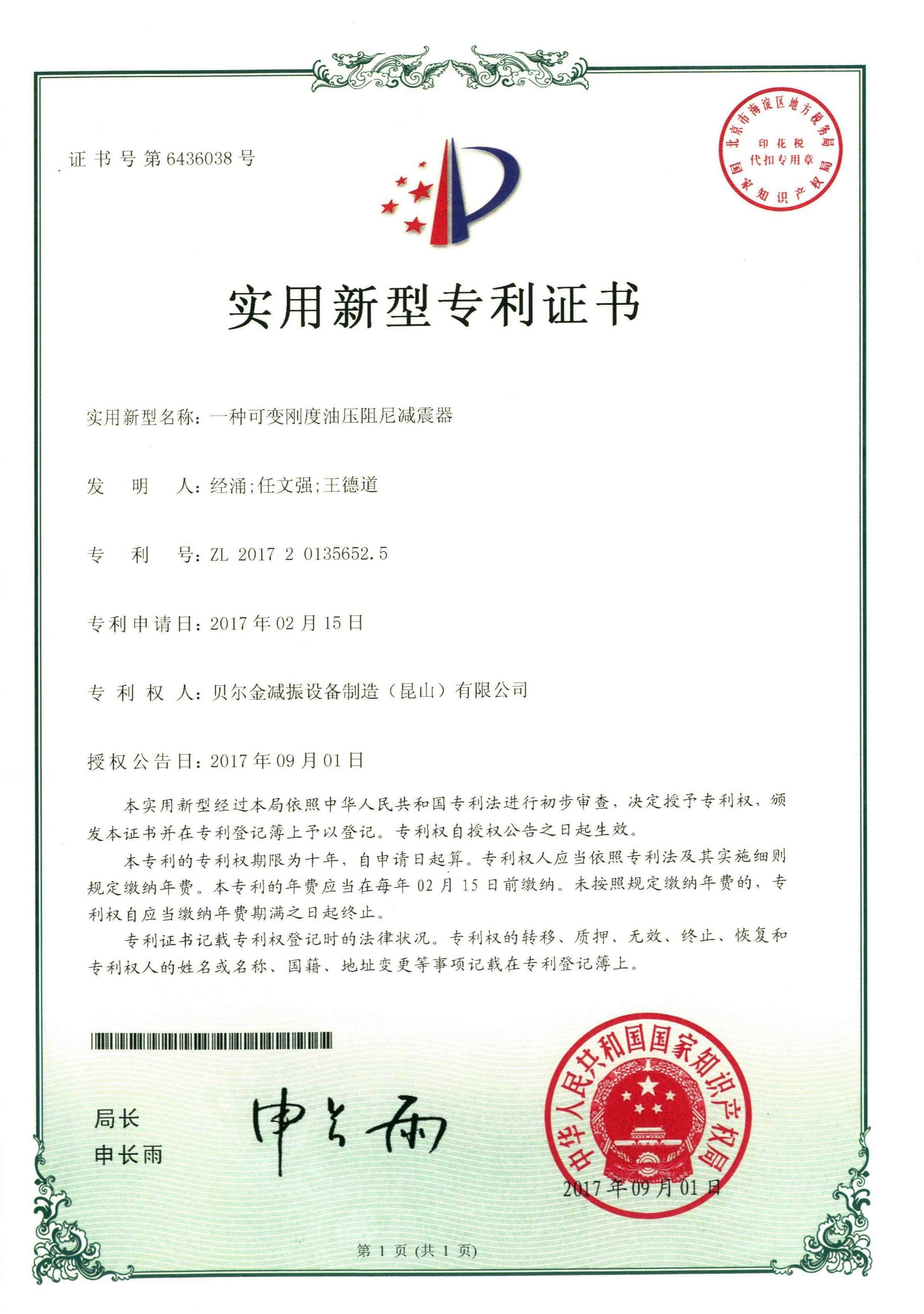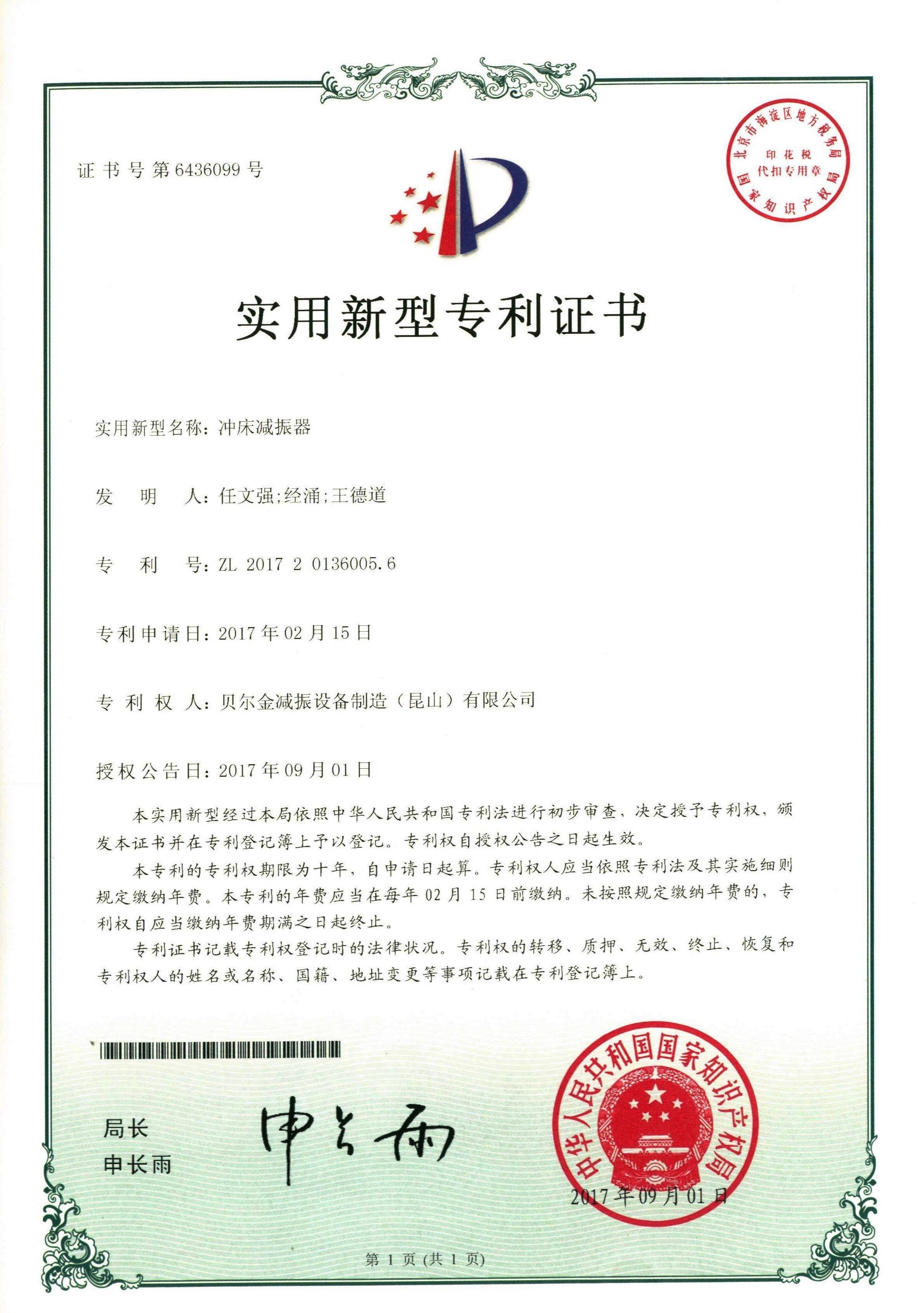 沖床減振器專利證書